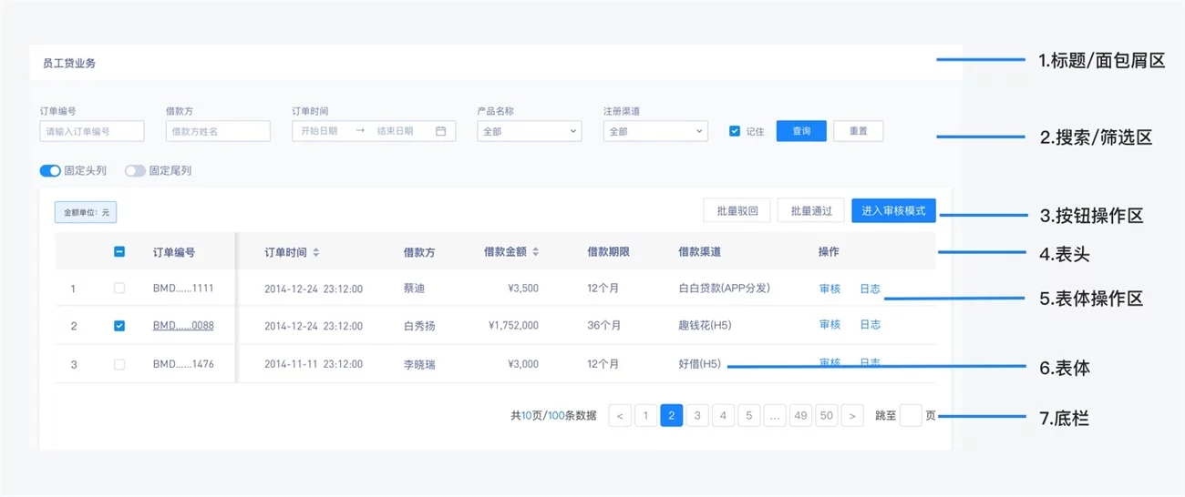 筛选区可以看作表格的导航。筛选区主要包括两部分,一是筛选,二是搜索。其目的相同,都是将操作者所关注的数据展示到前面,便于查看。