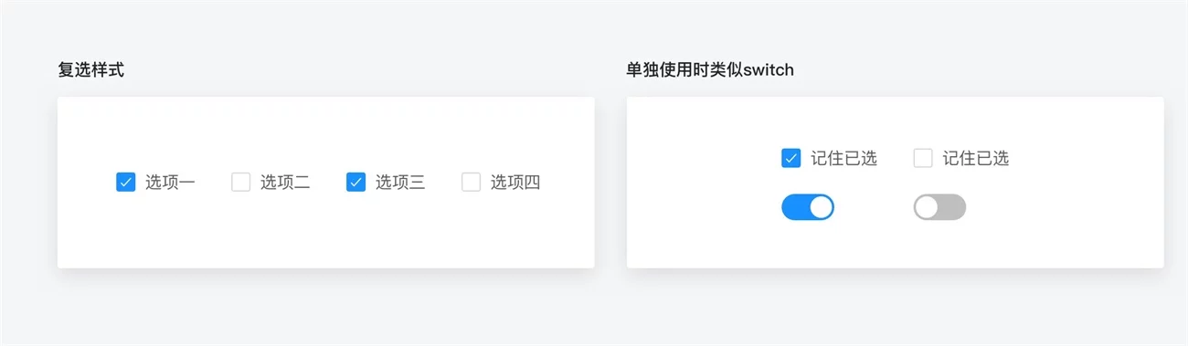 当复选框单独使用时可以用来表示另种状态之间的切换,这和开关(swtich)类似。