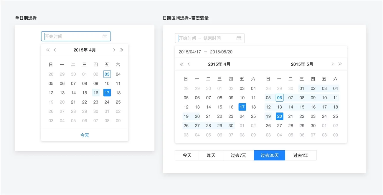 另外,要善用宏变量来为日期选择器赋能。所谓宏变量就是根据特定场景系统会提供一组动态变化值,每个宏变量包含若干变化的参照值,供用户快速选择,并可用作默认查询值,省去每次选择的繁琐操作。宏日期就是最常用的宏变量,如:今天、本周(最近 7 天)、本月(最近 30 天)、本年等。