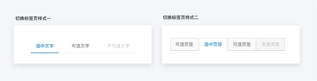 切换标签(Tabs)是常用的组件,多用来将平级的页面进行归纳和展现,保持界面整洁,即可用于容器顶部,也可用于容器内部。
