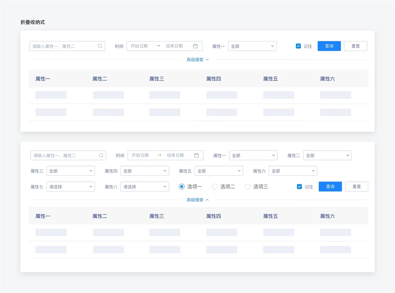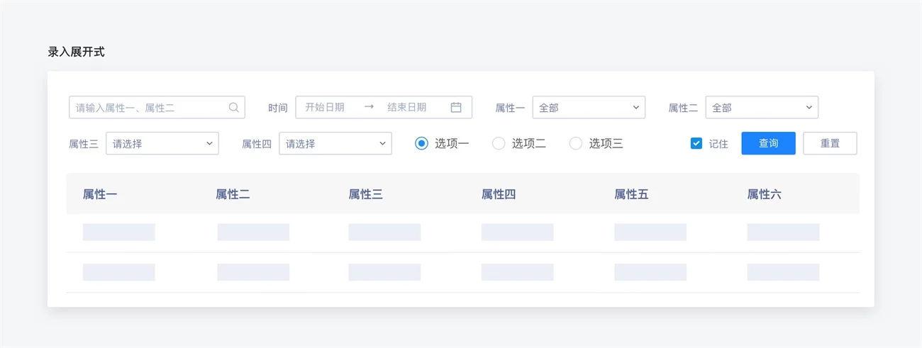 可以兼容多种数据格式,通常以 搜索框-日期选择器-下拉选择框-单选/复选框 的顺序来罗列展示。