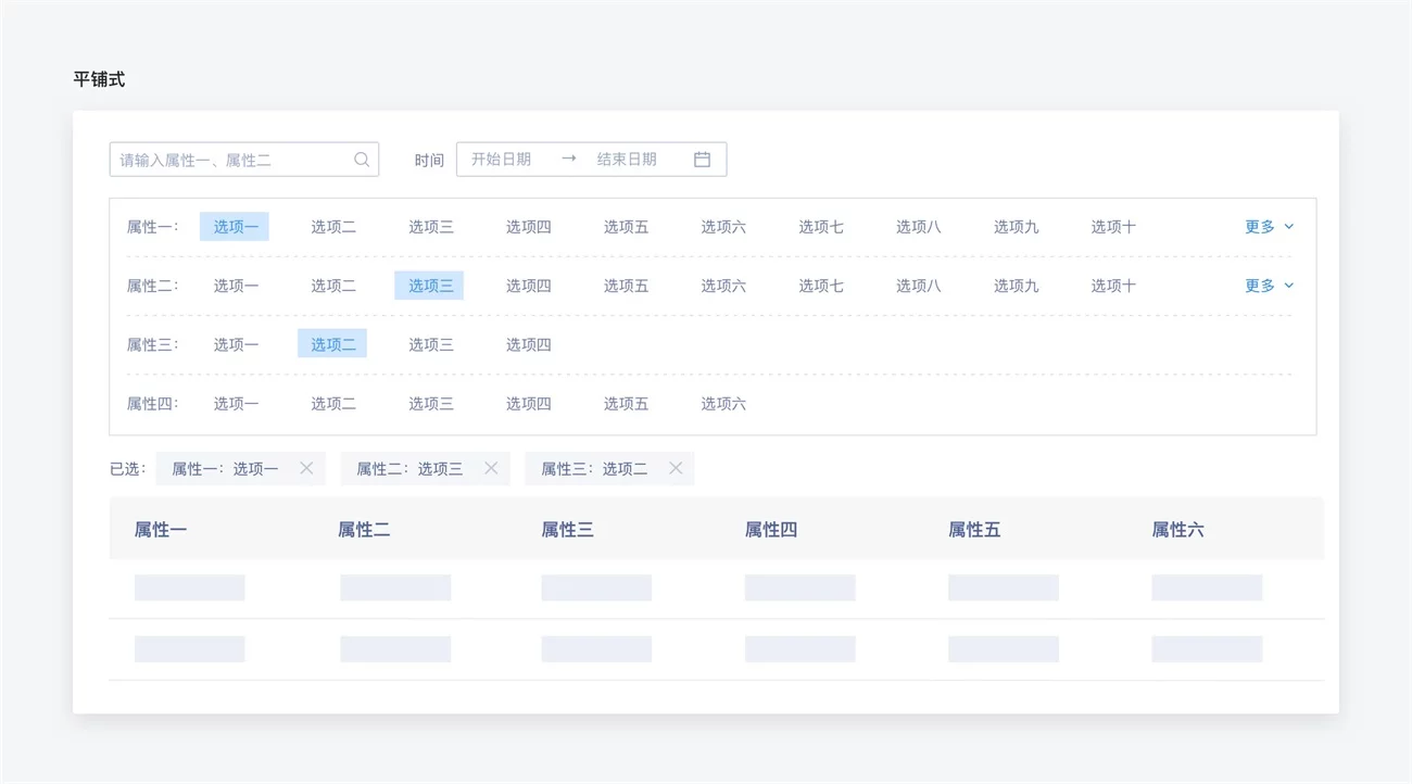 适用场景:适合多维度属性筛选场景,1920 宽的屏幕下筛选项数量建议不超过 2 行。最常用。