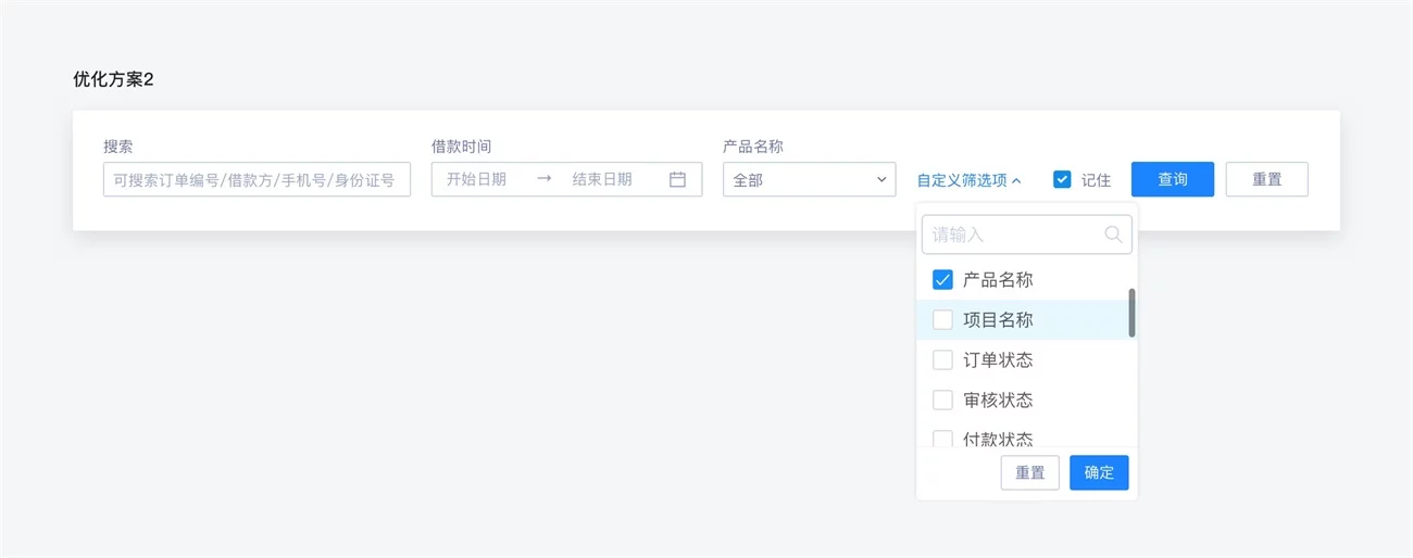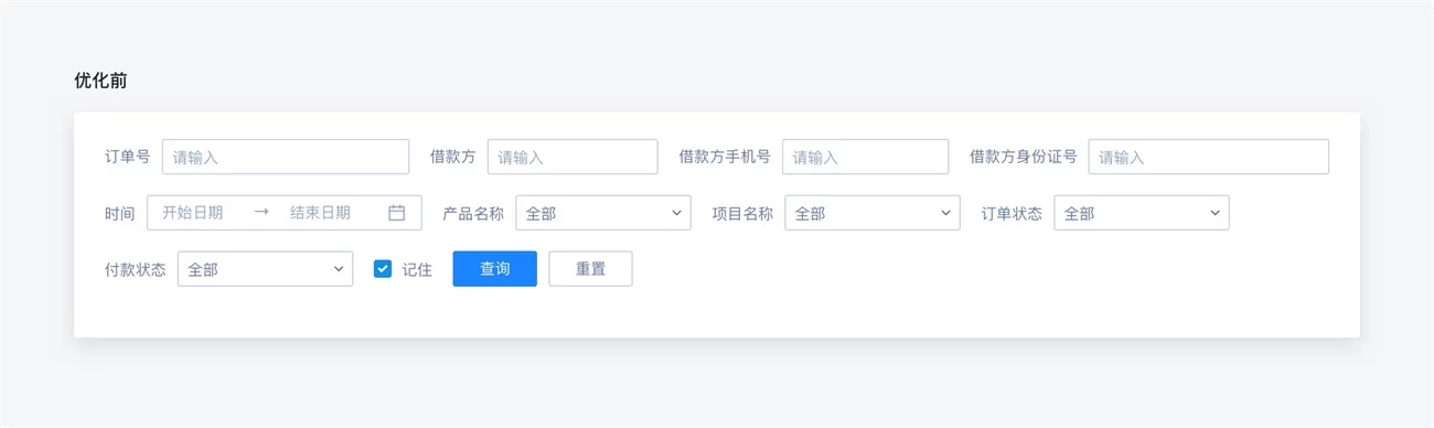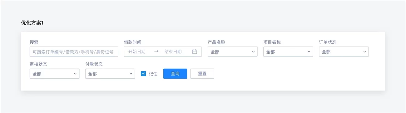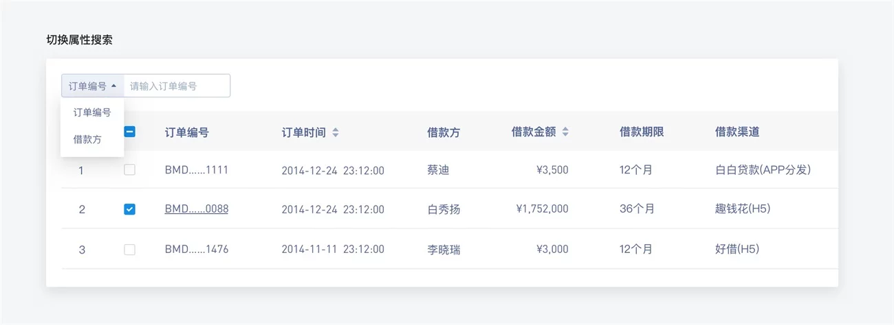 ①合并单一属性的搜索框。从业务逻辑上我们得知,如果用户有订单号,直接可以订单号锁定某个订单,因为订单号是唯一的,所以其他三项用不到;而借款方、借款方手机号和借款方身份证号这三个都是用户个人信息属性,其中手机号和身份证号搜到的结果肯定是一样的,借款方由于同名同姓的可能性存在,需要搭配其他筛选项。因此,不存在需要同时搜索多个属性才能得到结果的场景,合并单一属性搜索框合情合理。