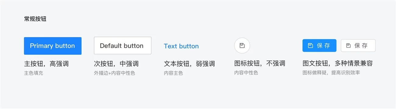 按钮用于开始一个即时操作,它通常是封装了一组操作命令,响应用户的点击行为从而触发响应的业务逻辑。