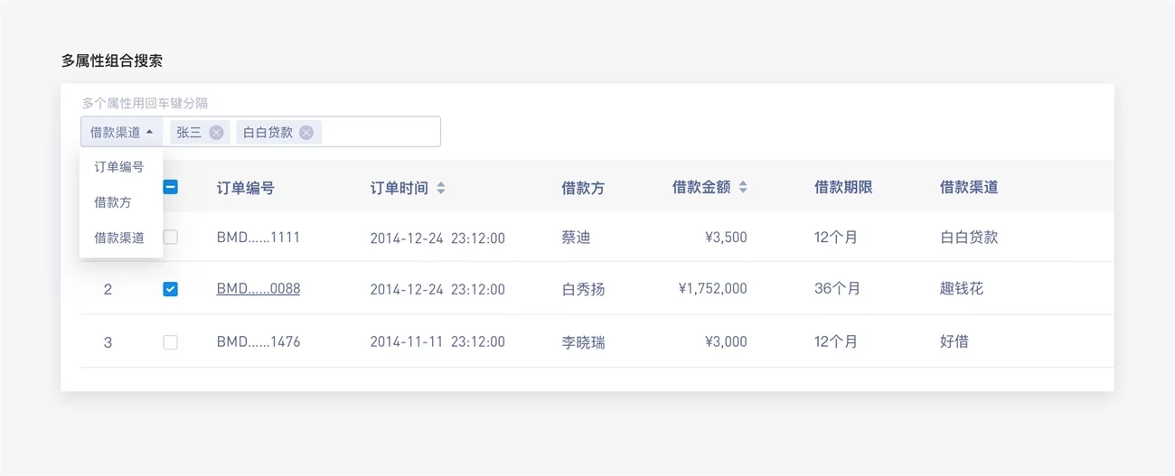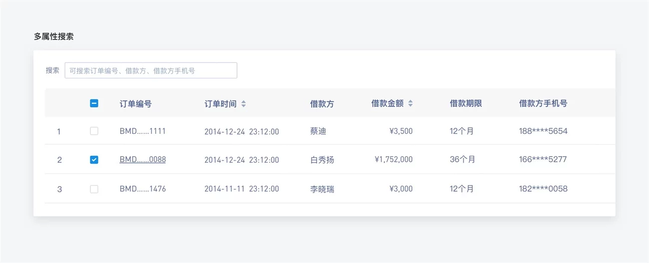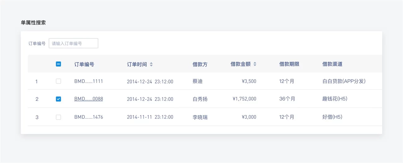 单属性搜索根据字段属性不同结果可能是唯一,也可能是多个。如“订单编号”这种具有唯一识别性的字段,搜索结果也是唯一的,而像“借款方”这种字段可能存在重名或者一个人对应多个订单的情况,搜索结果可能会有多个,例如有多个叫“张三”的借款方,或“张三”借了多笔订单。
