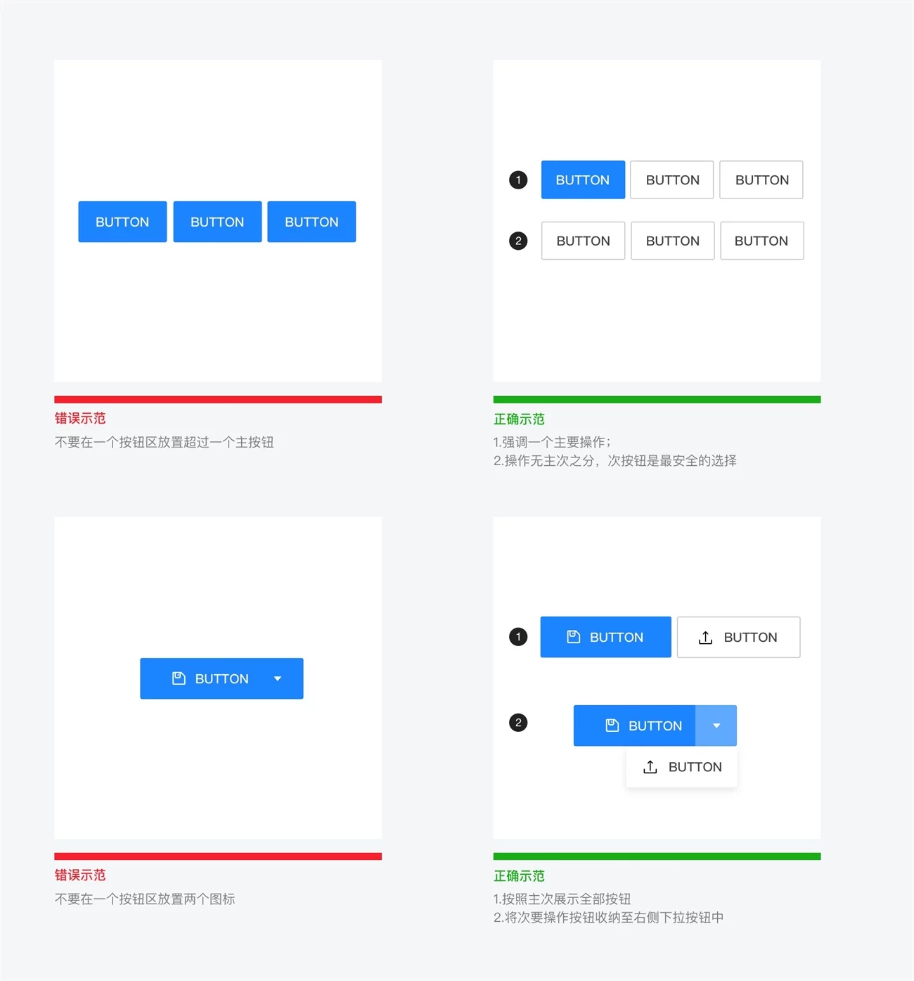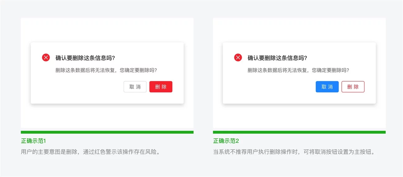 - 对话习惯:按钮放置顺序类似于电脑和用户的对话,优先询问用户可能需要执行的操作,或你希望用户执行的操作,最后向用户提供存在风险的操作。