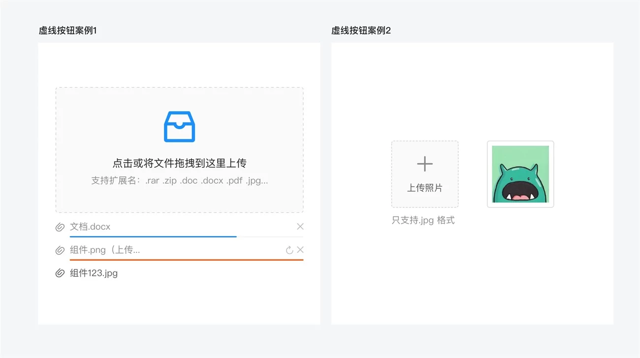 当需要在页面引导用户添加内容时,通常要用虚线按钮样式。虚线按钮由虚线描边和图标+文字组成。