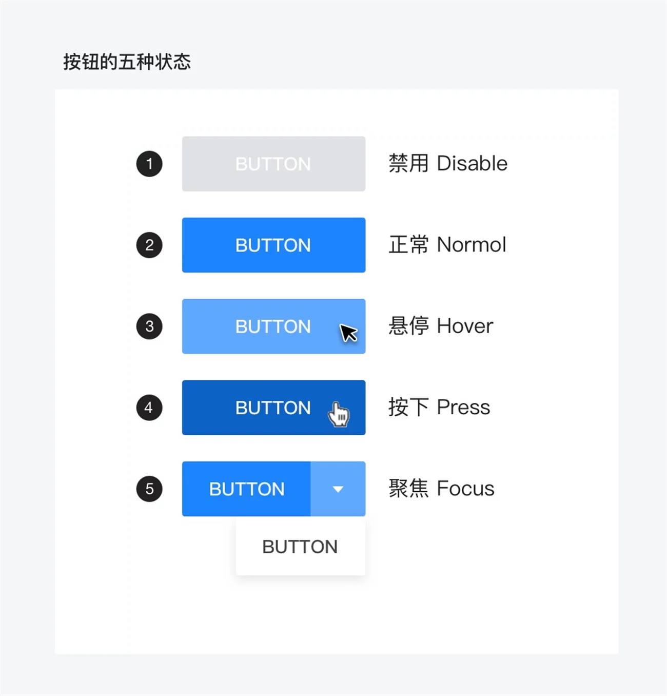常用的分为禁用/正常/悬停/按下/聚焦五种状态。正确的场景选用正确的状态,才能更好的引导用户使用。