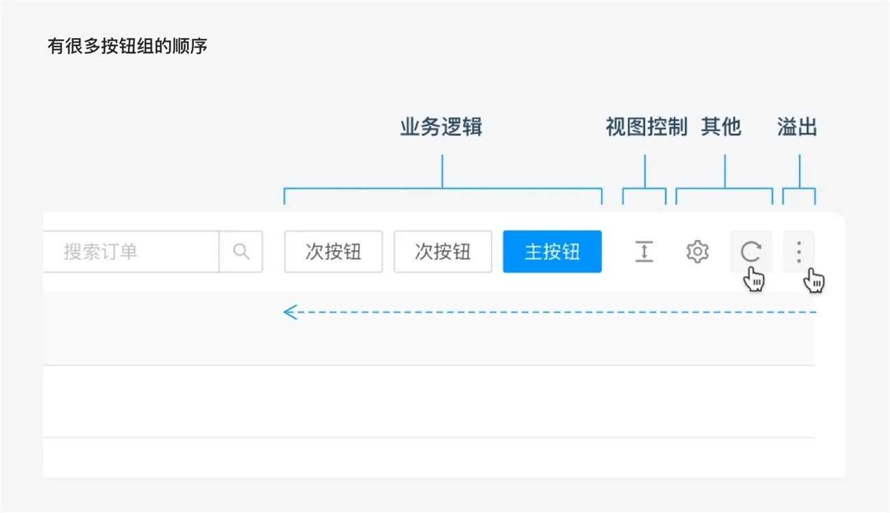 工具栏中的操作类型很多,我们会倾向于将变化较少的内容位置固化。以表格操作栏举例,排列逻辑如下: