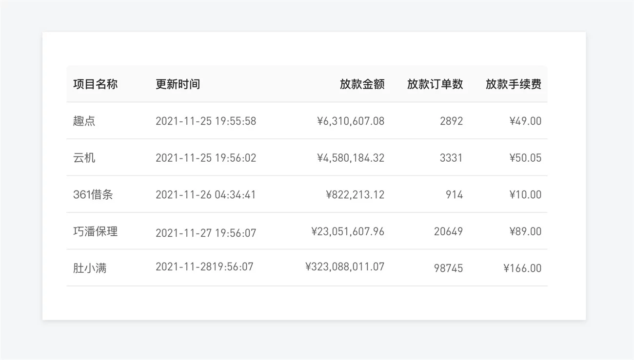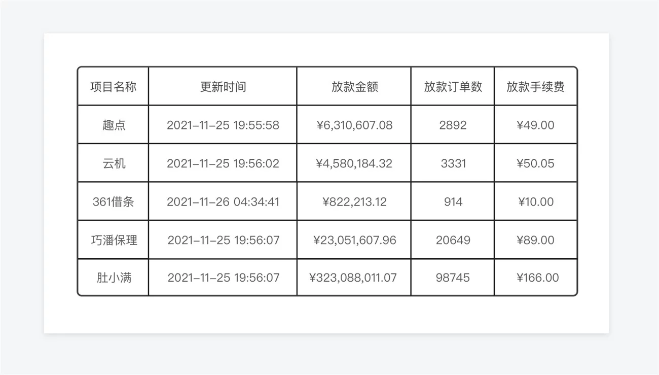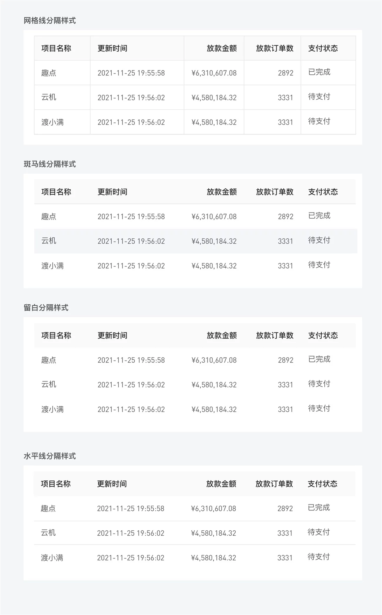 - 留白分隔更加精简,让用户对表格信息更加聚焦,但对上下左右空间要求较高且数据量不能太多,否则容易失去焦点造成视觉混乱;