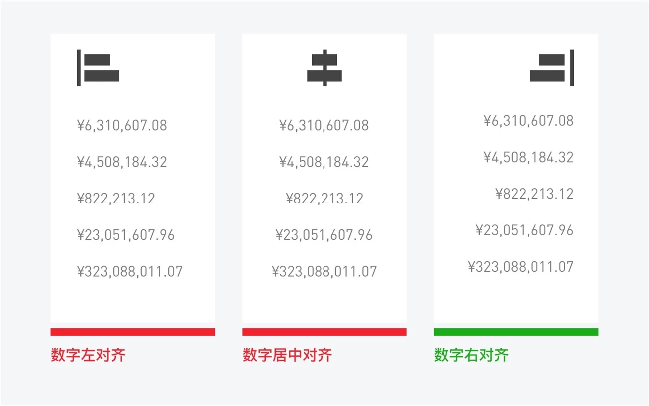 而表格中的数字需要右对齐,这是因为我们在阅读数字需要确认个十百千位,而个十百千位是从右侧开始确认的。比如数字金额 ¥23,051,607.96 这种千万级别的数字,是要从右侧开始逐一确认的。那有人会问,我可以通过千分符判断数字体量啊。其实就连千分符也是从右到左确认的,因此数字右对齐是对符合人的阅读方式。而且右对齐也能迅速判断出哪个数值的体量更大。