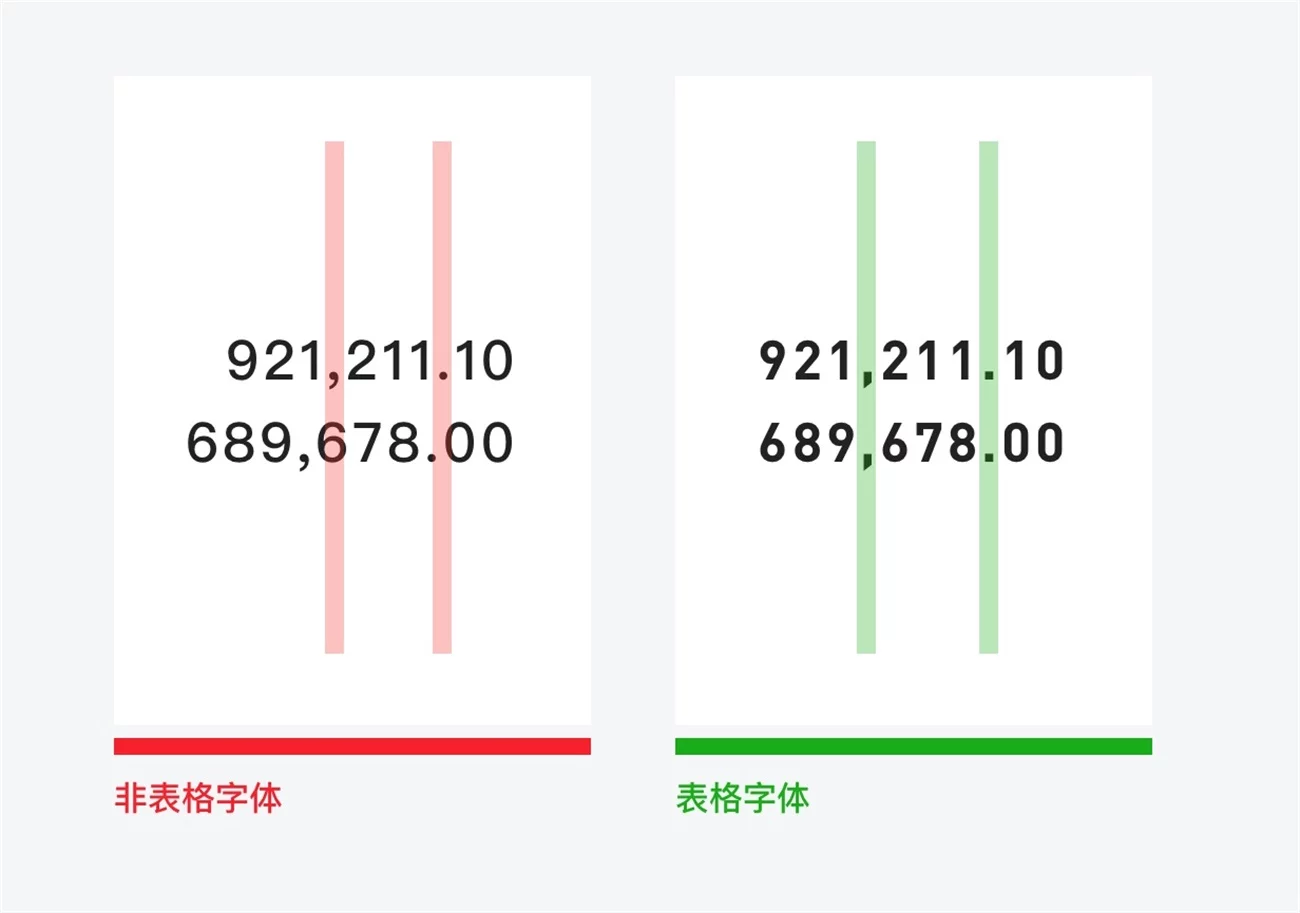 ③使用表格字体。表格中数字容易出问题的地方在于数字字体的选择,因为很多数字字体并不是等距设计的,比如数字“1”和数字“8”所占的字间距面积是不同的,如果遇到一组大量级的数字放在一起对比,就会误导用户,如图中所示,本来921,211.10大于689,678.00,但由于数字所占宽度不一样,就会在视觉上误导用户,而用了等宽度的表格字体,就可以客观的呈现数据。