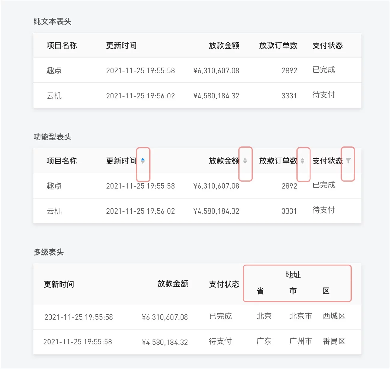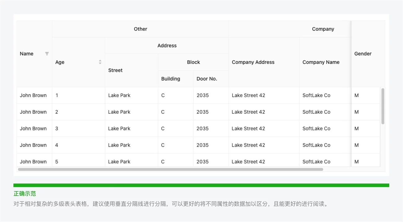 比较特殊的是复式表头,使用这种表头的表格,最好还是保留垂直分隔线,因为复式表头对数据的分隔要求更高,如果不加以视觉引导,很容易造成被数据干扰视线。还有就是有导出需求的表格中,不建议采取复式表头的设计,因为复式表头往 excl 粘贴时经常会出现错误。
