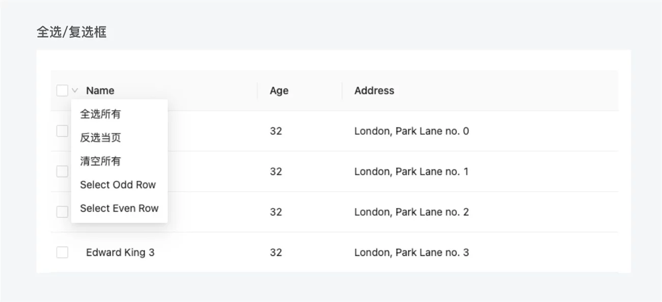 ①全选/复选框:全选有两种情况,一种是全选当前页面的所有数据,一种是全选所有数据(即如果有10页数据,则这10页数据全部选上)。而复选则可以做任意的选择,通常复选不能跨页操作,即切换页面后,前一页勾选的数据取消勾选。