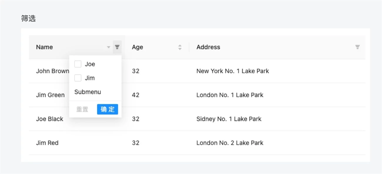 多功能表头常见功能包括:全选/复选框、排序、筛选、搜索