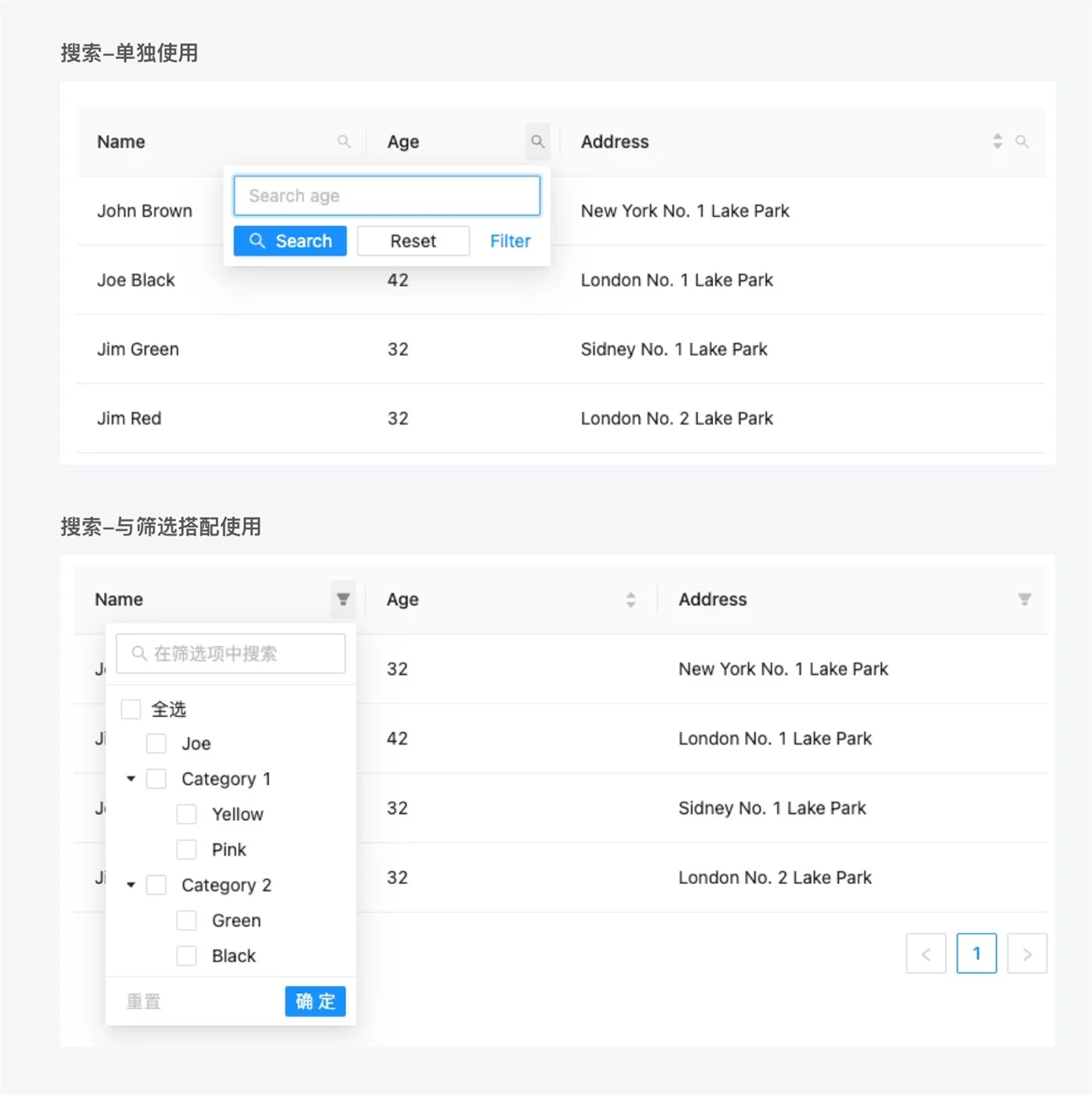 ④搜索:即对于一列的数据在表头进行搜索,来节省空间。通常也可以和筛选搭配使用。另要注意,跟筛选项搭配使用时,建议支持实时的模糊搜索。