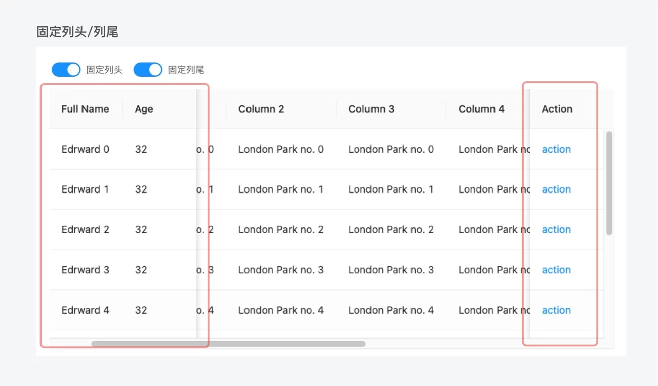 表格左上放固定列头列尾的开关可以提高表格的泛用性。一般来说没有操作栏的表格直接可以用响应式设计,即单元格宽度随着屏幕视窗宽度自动变化;而固定列头列尾后,列头列尾的单元格宽度需要固定,而没有固定的中间部分单元格则依然遵循响应式设计。