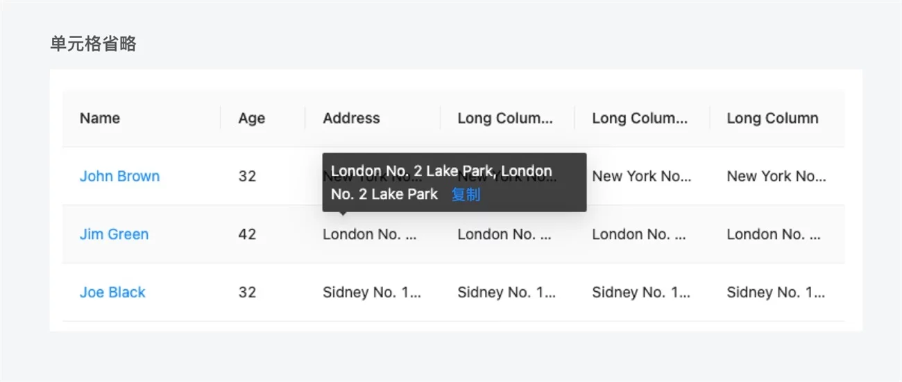 鼠标 hover 住省略的单元格时会弹出气泡对话框,对话框内显示完整字段。如果有“复制”完整字段的需要,还可以再对话框内添加“复制”的快捷按钮。