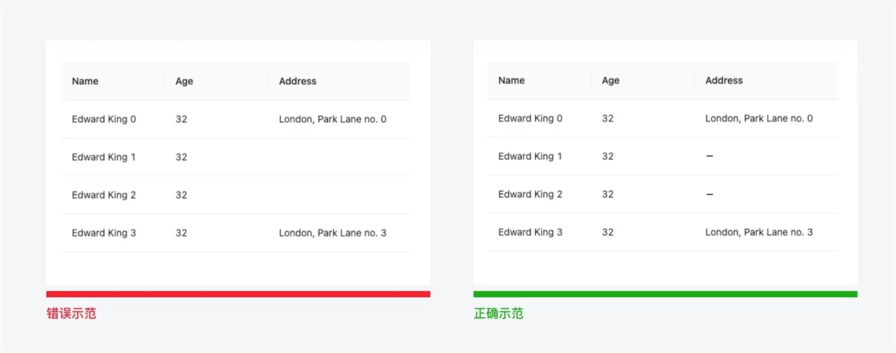 在后台表格中经常会出现数据缺失的情况,这种缺失大多是暂时性缺失而非错误导致的 bug,如果空着不做任何处理,就会给用户造成疑惑。正确的做法是要用短线“-”来填充单元格,这样用户就会知道“哦,这里数据缺失”而不是“为啥这里啥都不显示”。