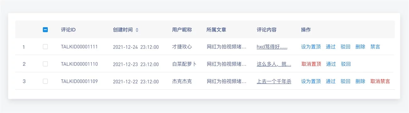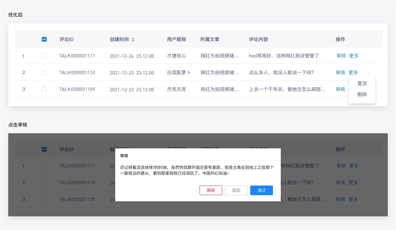②通过、驳回、删除,本质就是审核三板斧,且流程是先看评论内容再做审核操作,所以进行合并;