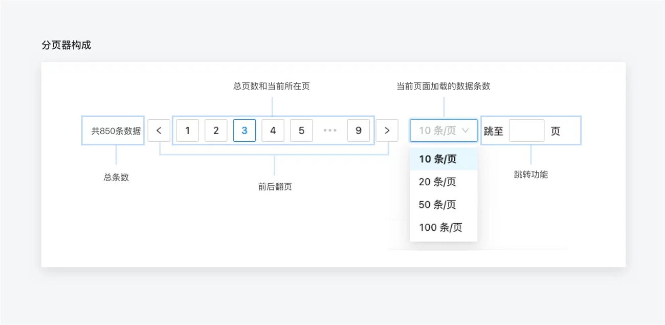 - 完整分页器:可以设置每页的显示条数,适合大数据量。用户可以根据自己的显示屏调整显示条数以提 高数据处理效率。对于条数的设置,可以选择已设置的条数,也可以手动输入设置条数。