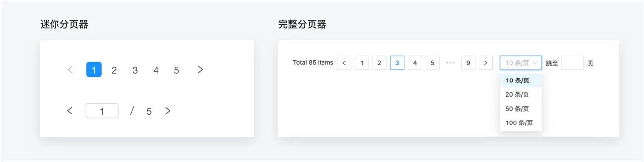 - 迷你分页器:不可以设置每页条数,没有跳转功能,通常用在数据量小的场景。