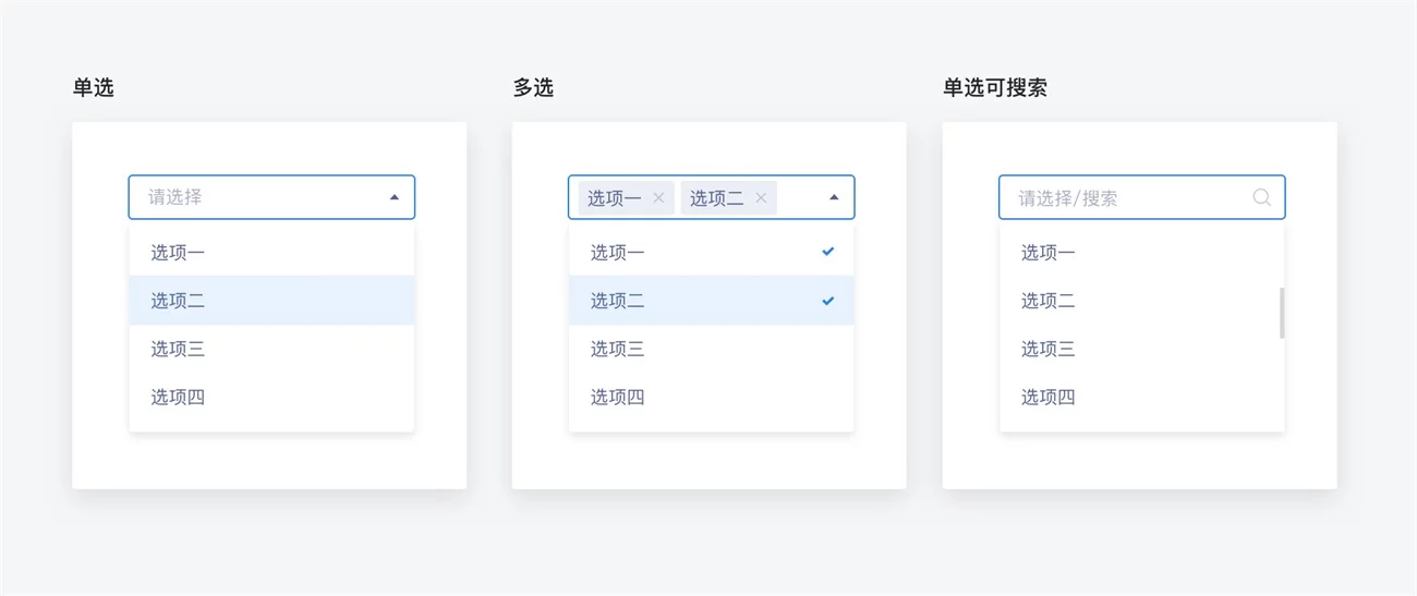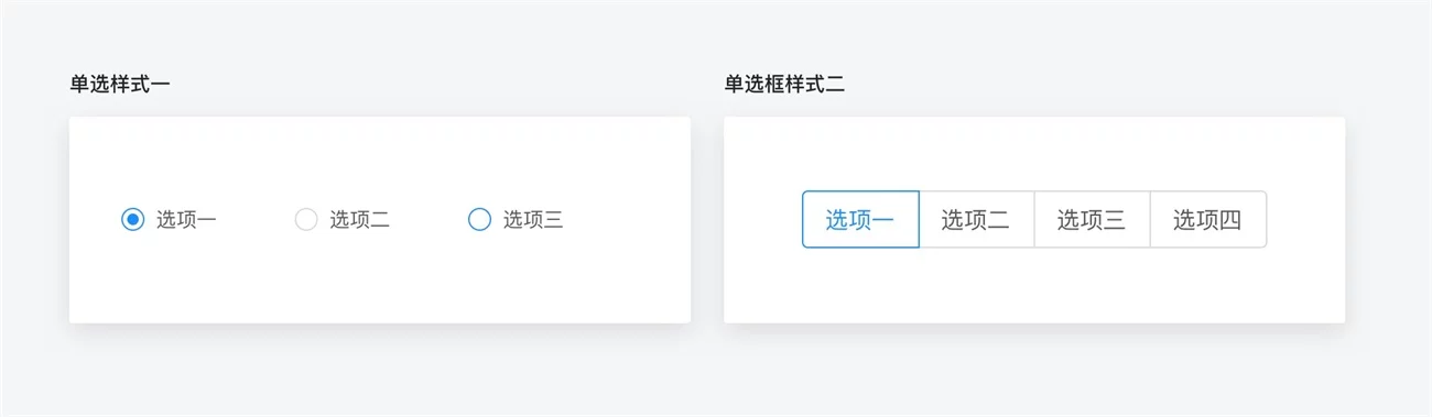 单选框(Radio)常用于在多个备选项中选中单个状态。和下拉选择器不同的是,单选框所有选项默认可见,方便用户在比较中选择,因此选项不宜过多,通常不建议超过 4 个。另外,单选框选项需要默认选中第一个,且与其他选项是互斥的。