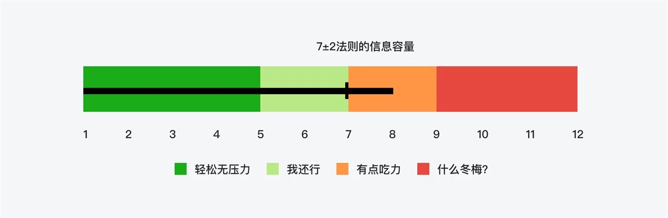 米勒定律也叫 7±2 法则,是指短时间内一般人记忆信息的容量为 7 加减 2,即“7”是人类短时记忆的容量天花板。
