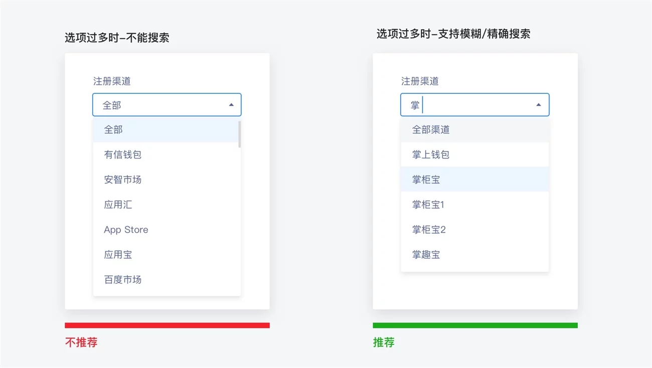 B 端用户与 C 端用户的成长轨迹不同,熟练的 B 端用户通常会记住自己经常查看数据的编码或名称,因此当下拉选择选项过多时,单纯的鼠标操作反而效率很低,而直接搜索关键字搜索反而更有效率。通常模糊搜索和匹配结果实时刷新需要同时支持,且匹配的结果还可以根据用户的使用习惯默认显示高频数据。如下图所示,注册渠道有将近 30 多个,有时候需要下拉很久才能找到想要的结果,而通过关键字搜索和高频数据的优先处理展示会极大的提高用户工作效率。