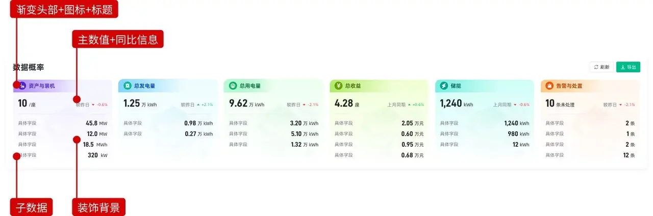 这次实战中,我踩坑最深、重做次数最多的地方,就是顶部的 6 个统计卡片。(这也是后台系统里为数不多还能稍微做点样式的区域。)