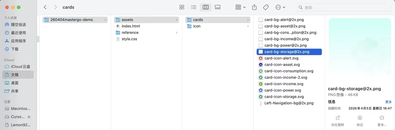 我吸取教训之后,把文字改成代码写,icon 用 SVG,背景图只留装饰。
