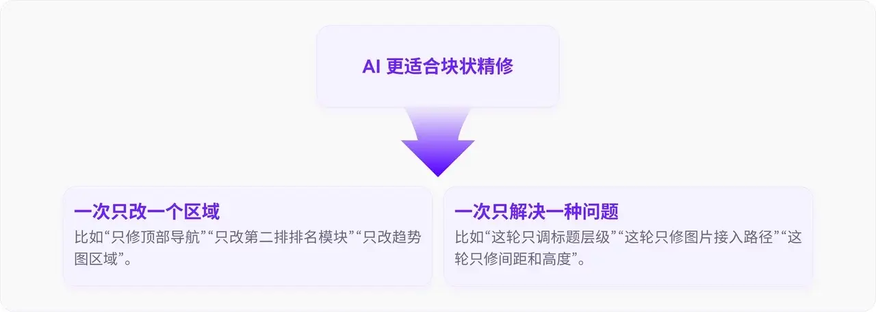 比如“现在只修顶部导航、只改第二排排名模块、只改趋势图区域”,改对、验收、存档。