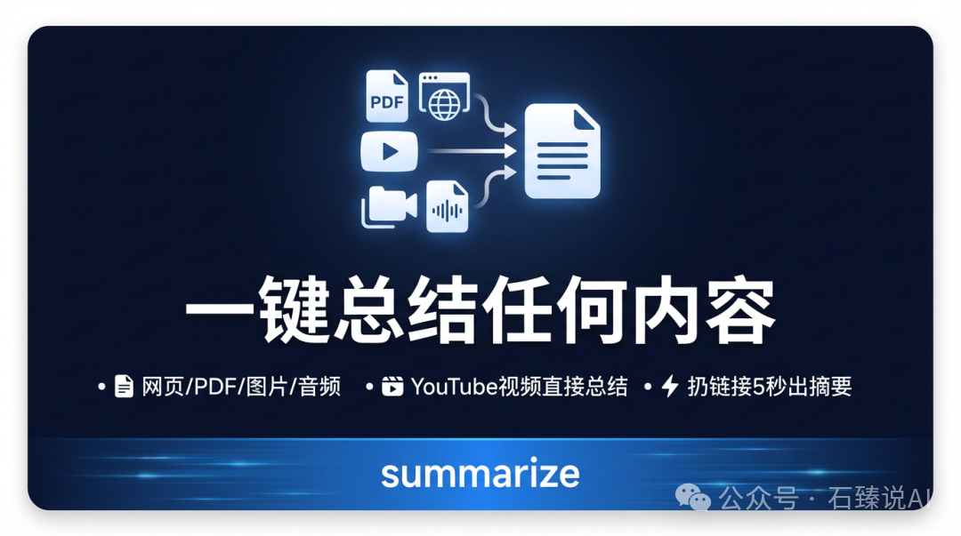 扔给它一个链接或文件——网页、PDF、图片、音频、YouTube 视频——直接输出摘要。
