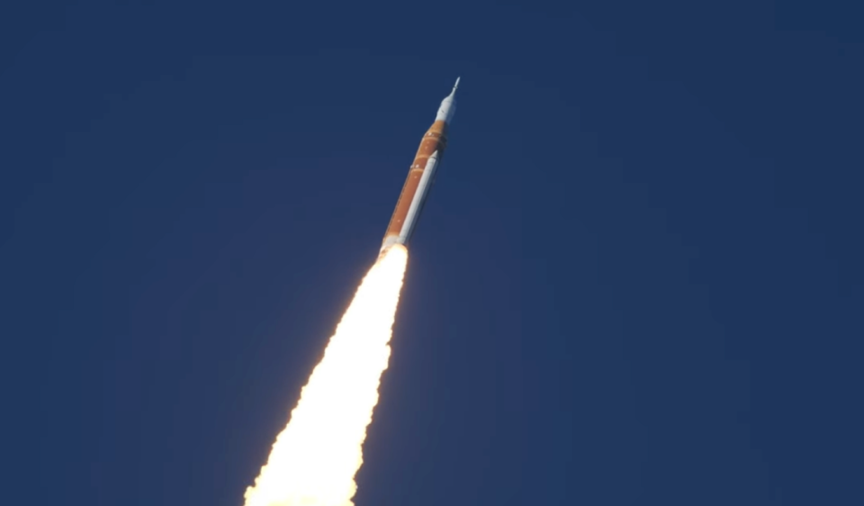 执行本次发射任务的是一款叫Block1的火箭,从外形和涂装上也能猜得出来,这款火箭实际上是从航天飞机演变而来。两侧细长的固体火箭助推器,橙色的芯级火箭,无不透露出航天飞机的影子。
