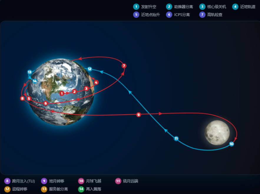 阿尔忒弥斯2号载人任务,采用“8字形”自由返回轨道,飞船在飞越月球背面后,无需额外推进即可借助引力自然返回地球,整个任务时长预计约为10天。