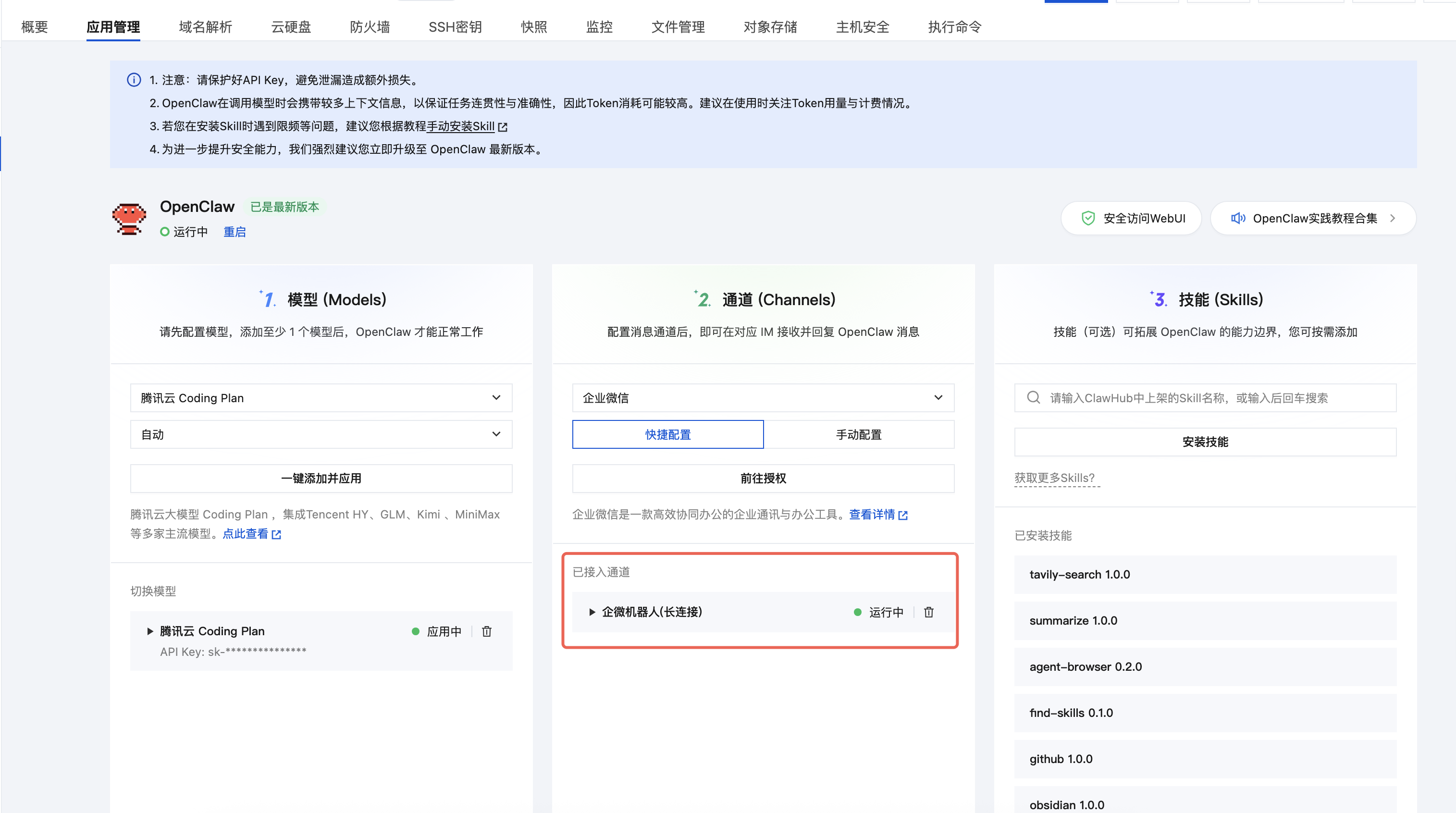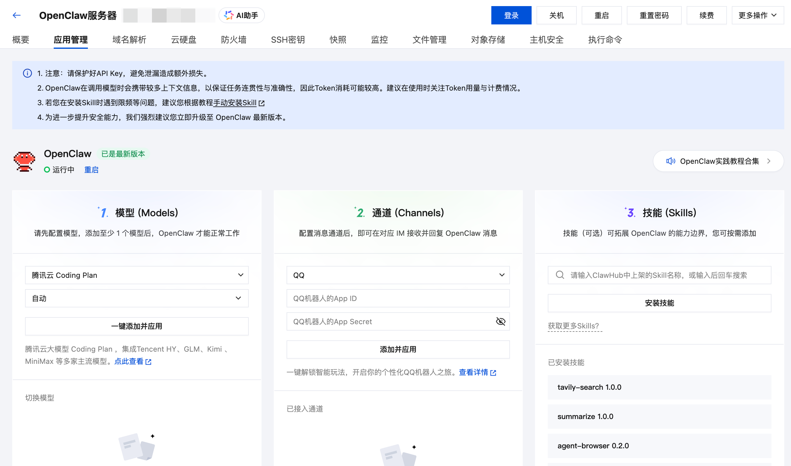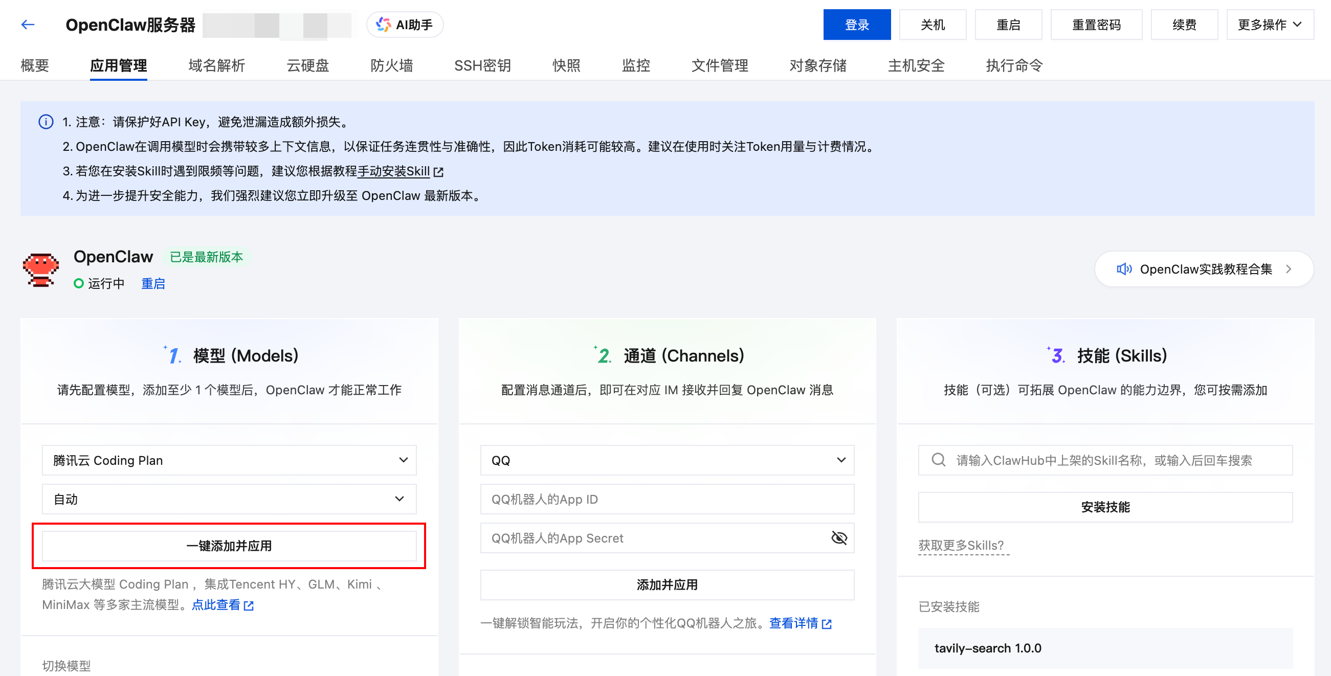 进入轻量云Lighthouse控制台,找到已部署OpenClaw的轻量应用服务器,点击服务器实例卡片上的“🦞配置”即可进入“应用管理”页面。