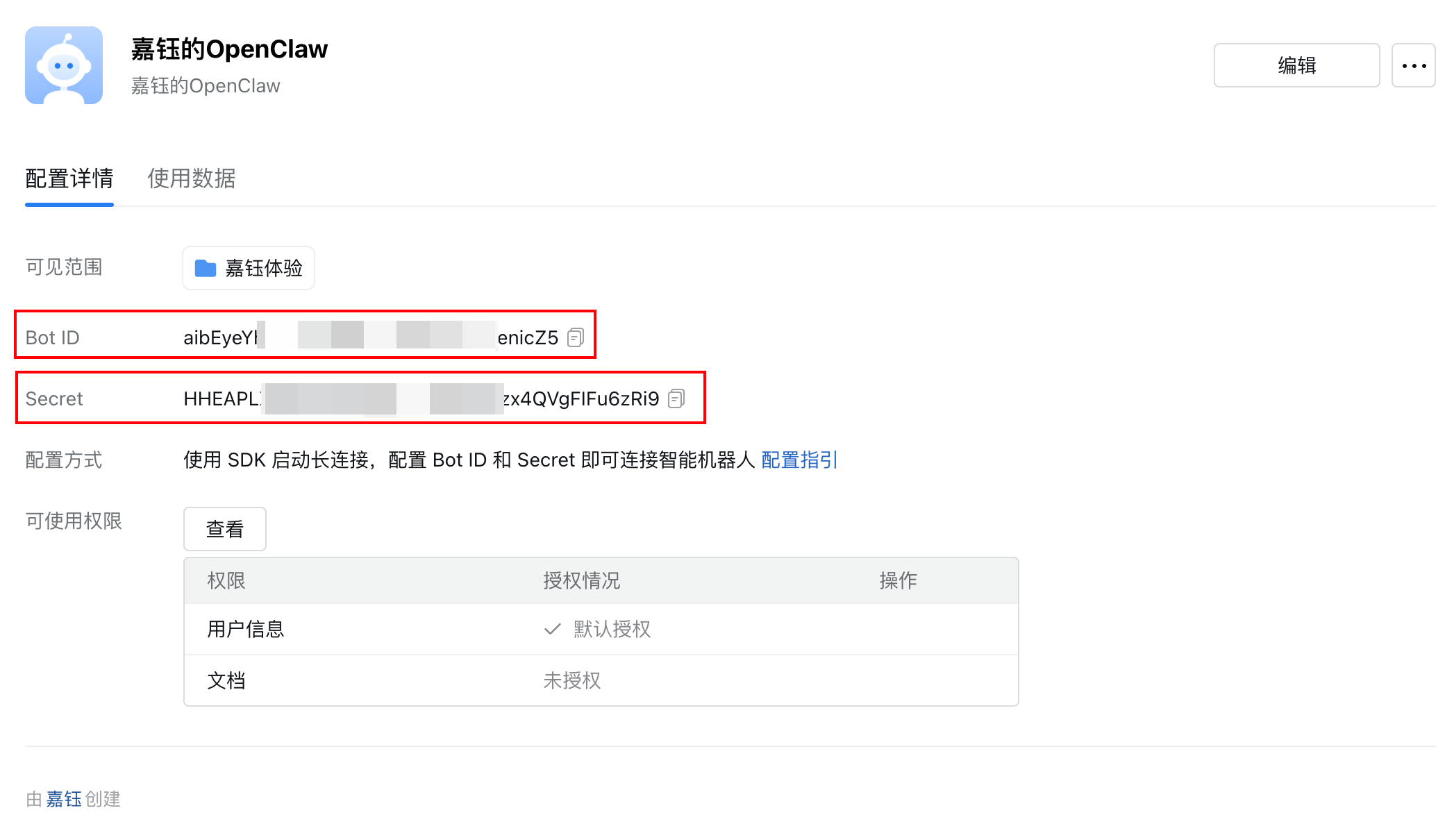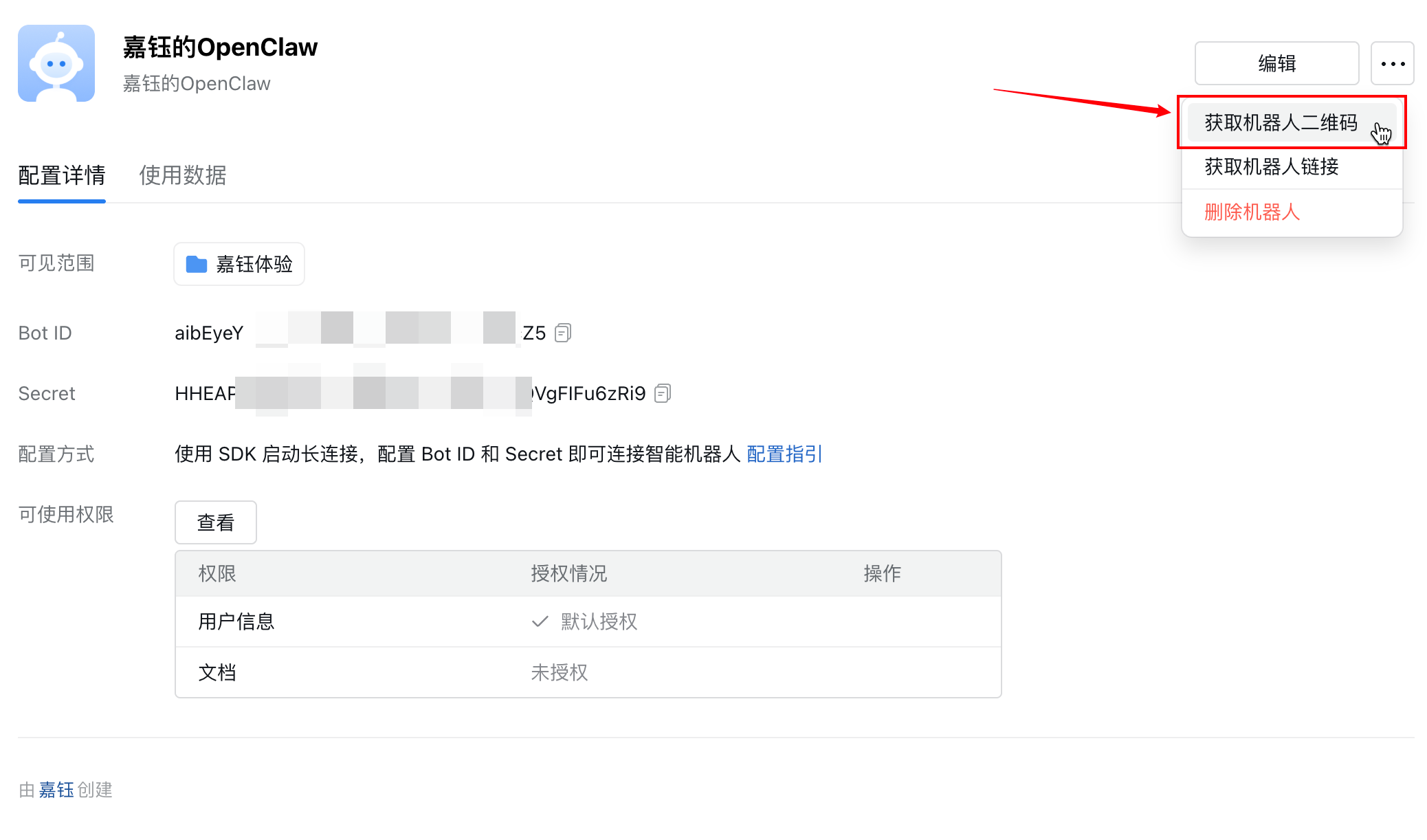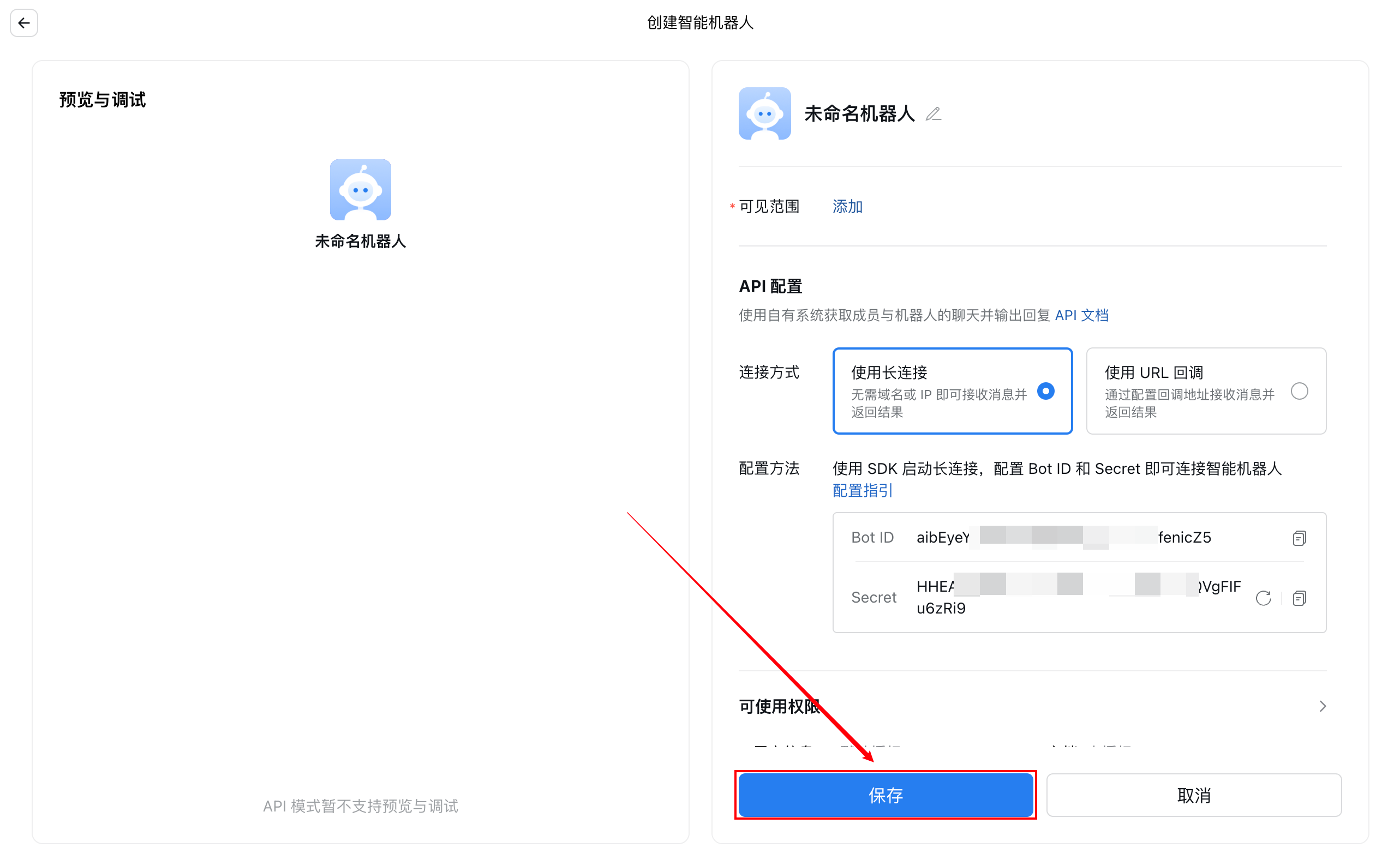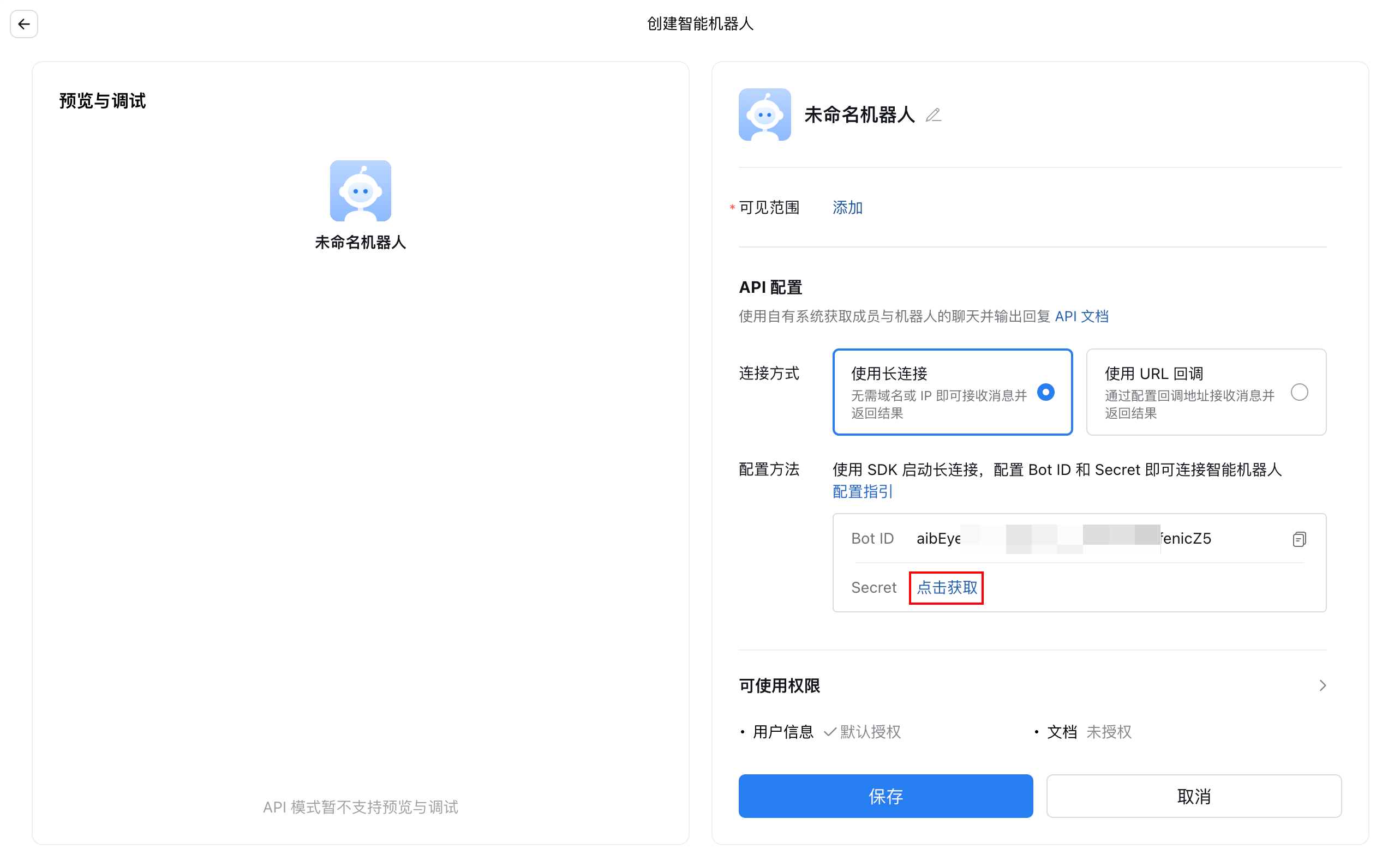 选择以「长连接」方式创建,在配置方法中的Secret处单击点击获取: